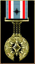 The Distinguished Flying Cross [DFC] is awarded to all Military personnel in command of Capital, Freighter or fighter class ships for an act or acts of valor, courage or devotion to duty performed whilst flying in active operations against the enemy. A straight silver bar is awarded for further act or acts of valor, courage or devotion to duty whilst flying in active operations against the enemy. The slip-on bar has an Lucrehulk Battleship in the centre. The year of the award is engraved on the reverse, along with the name, rank and unit of the recipient.
