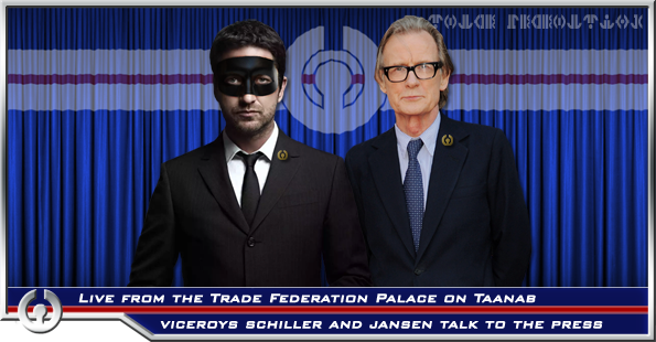 Jacob Jansen holds his hand up to quiet the army of press in the conference room of the Trade Federation palace. They are much louder than normal after TFNN released a tip that the Viceroy's announcement today would be of great importance. Off to the right of Jacob stands Regent Nohv Schiller, hands at his sides eyeing someone in the background. Slightly off to the Regent's side stands the entire Trade Federation Cabinet.::